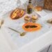 round fluted wood coffee table with vertical detailing styled with modern candlesticks in neutral room